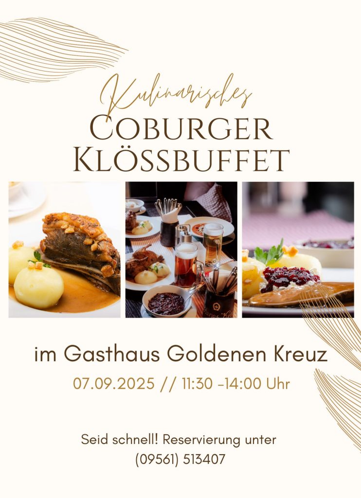 Am Sonntag, den 07. September, findet im Restaurant Goldenes Kreuz in Coburg von 11:30 bis 14:00 Uhr das große Kulinarische Coburger Klößbuffet statt. Dieses besondere Event ist ein Muss für alle, die fränkische Spezialitäten in ihrer besten Form genießen möchten.